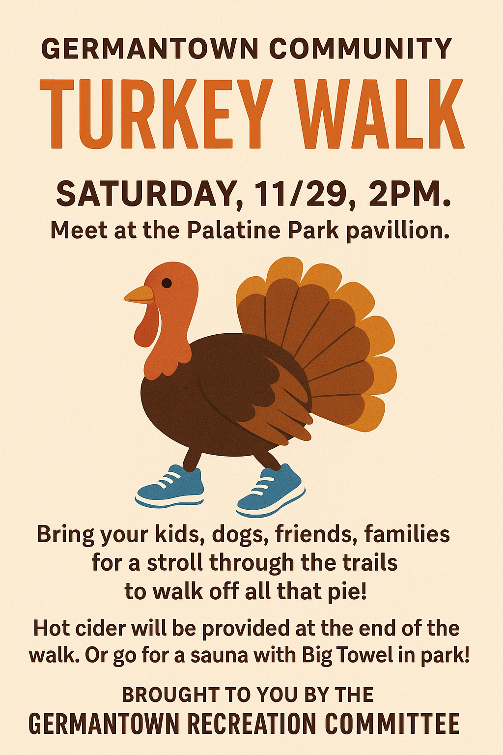 Join neighbors, friends & family at the First Annual Germantown Turkey Walk. Thank you Germantown Recreation Committee for bringing new programming to our town!
